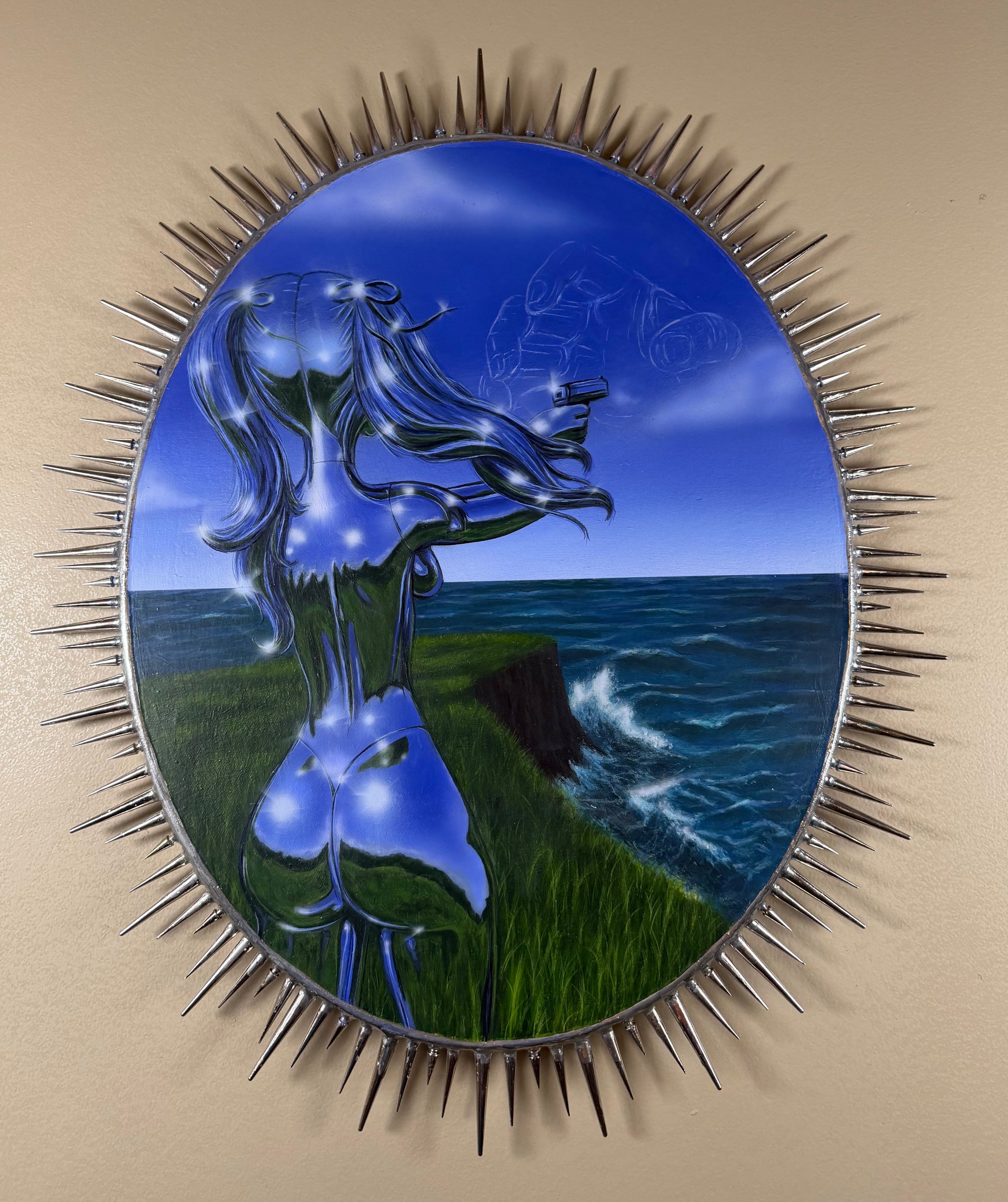 The reference picture for this was taken my first time going to a range. I did so after being followed through the woods by a creepy man when I was on a walk with my son. I felt terrified and hopeless in that moment, and decided that I needed to know how to defend myself so that I didn’t feel that way again. Through the process of making this piece, there were quite a few other times where I felt this way. From larger things like depressing news about the state of the world and my country descending into darkness, to more personal issues like AI being used by people online to remove my clothing without my consent. These are all things that feel bigger than me, things that I don’t quite know how to defend myself from. Instead of letting the weight of the world bring me down I did what I do best- alchemised these feelings into art.